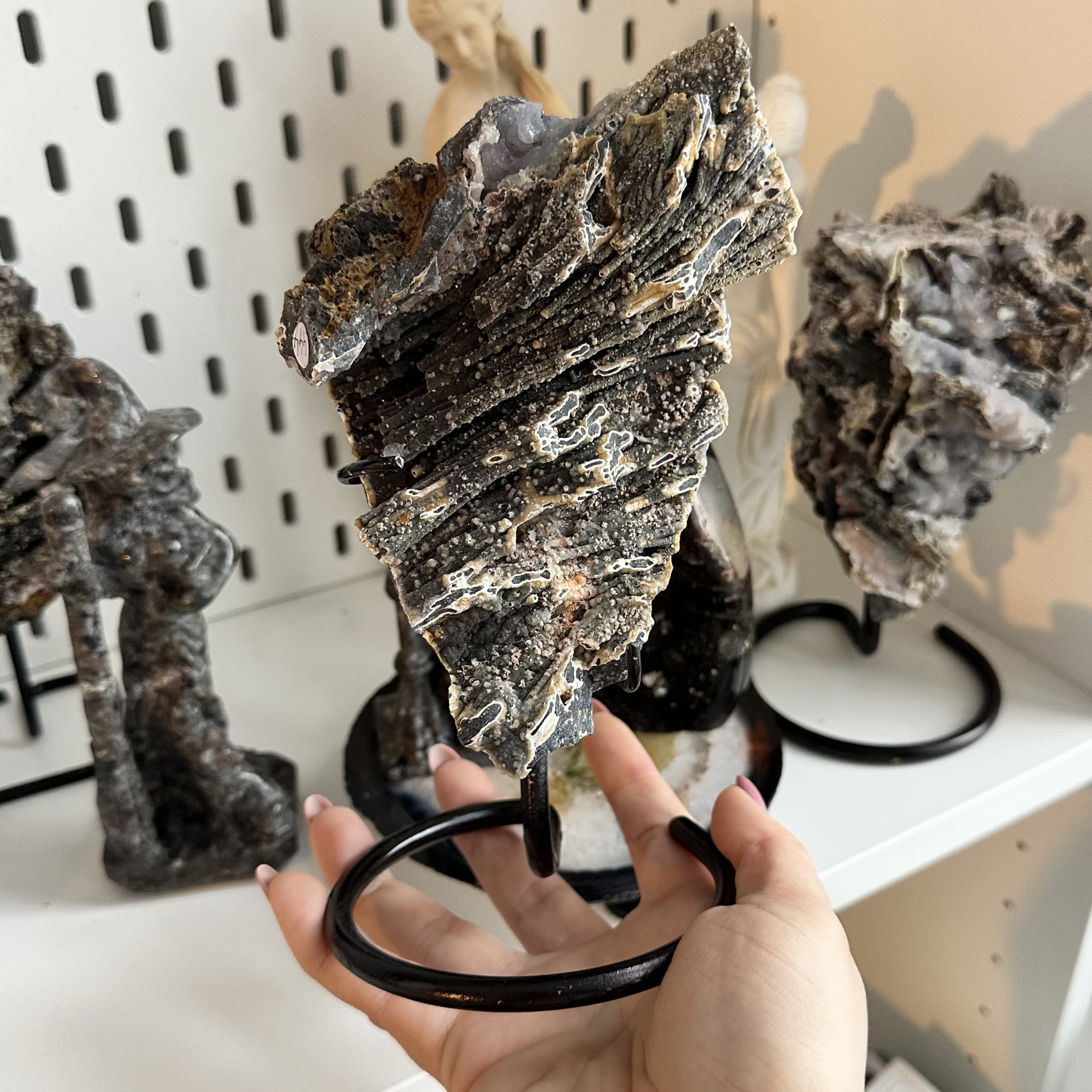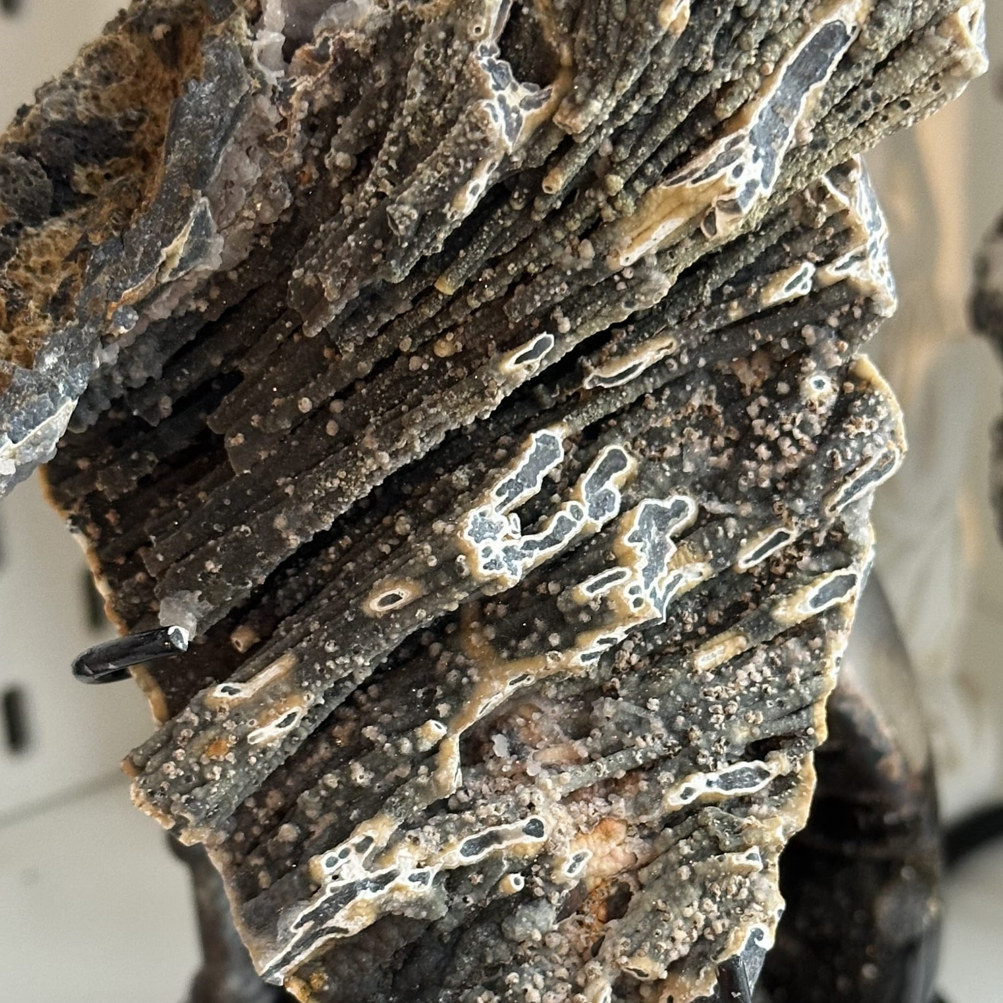 Agat z chalcedonem surowym na stojaku, surowa druza F52